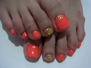 TOP > ネイルデザイン例 > オレンジ×ゴールドペディネイル