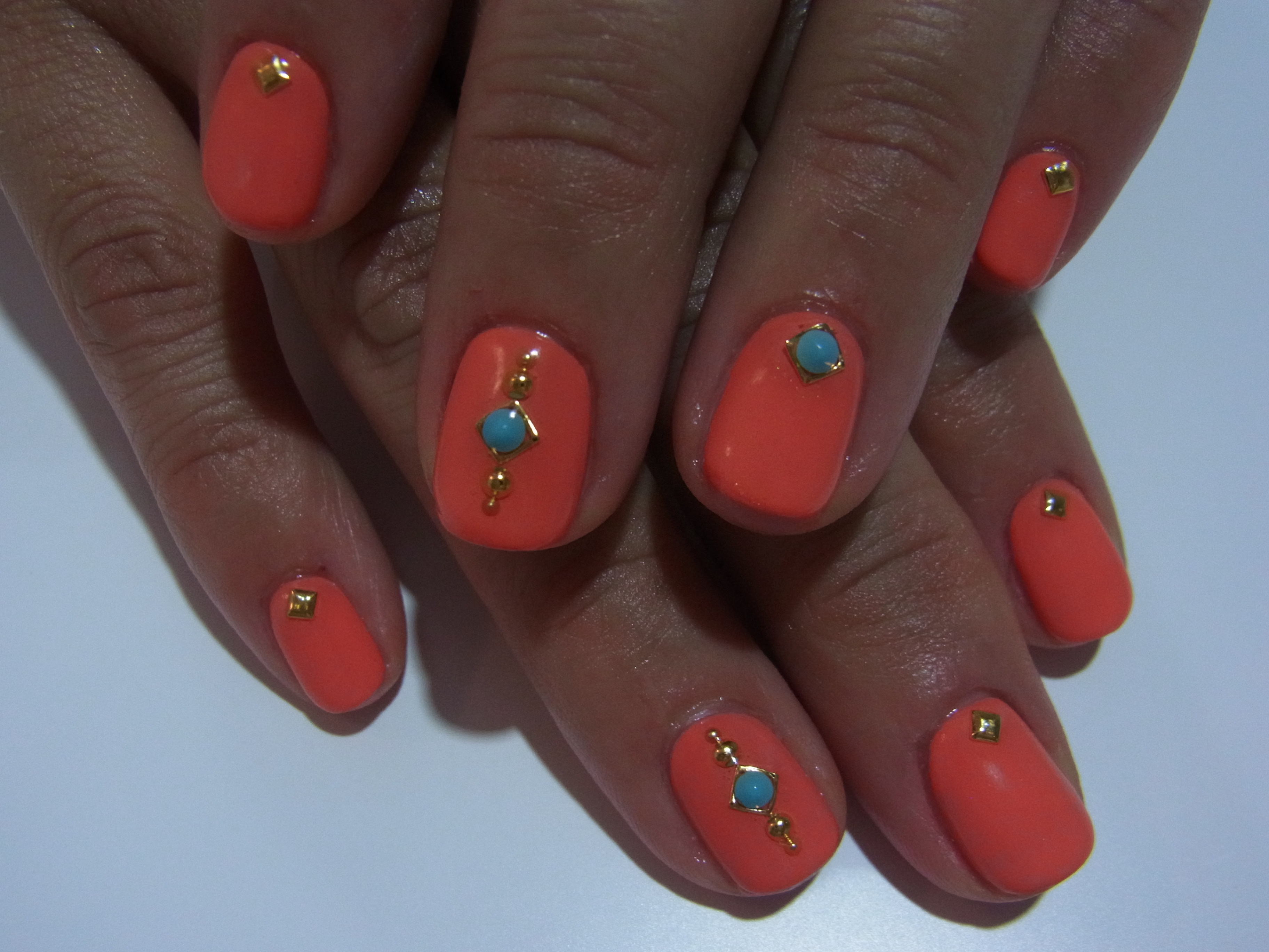 ネオンカラーとターコイズのストーンが夏にぴったりのネイルですね!