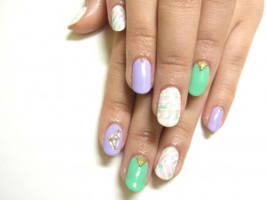 ラベンダーカラーとグリーンネイルをスタッズとストーンでまとめました。