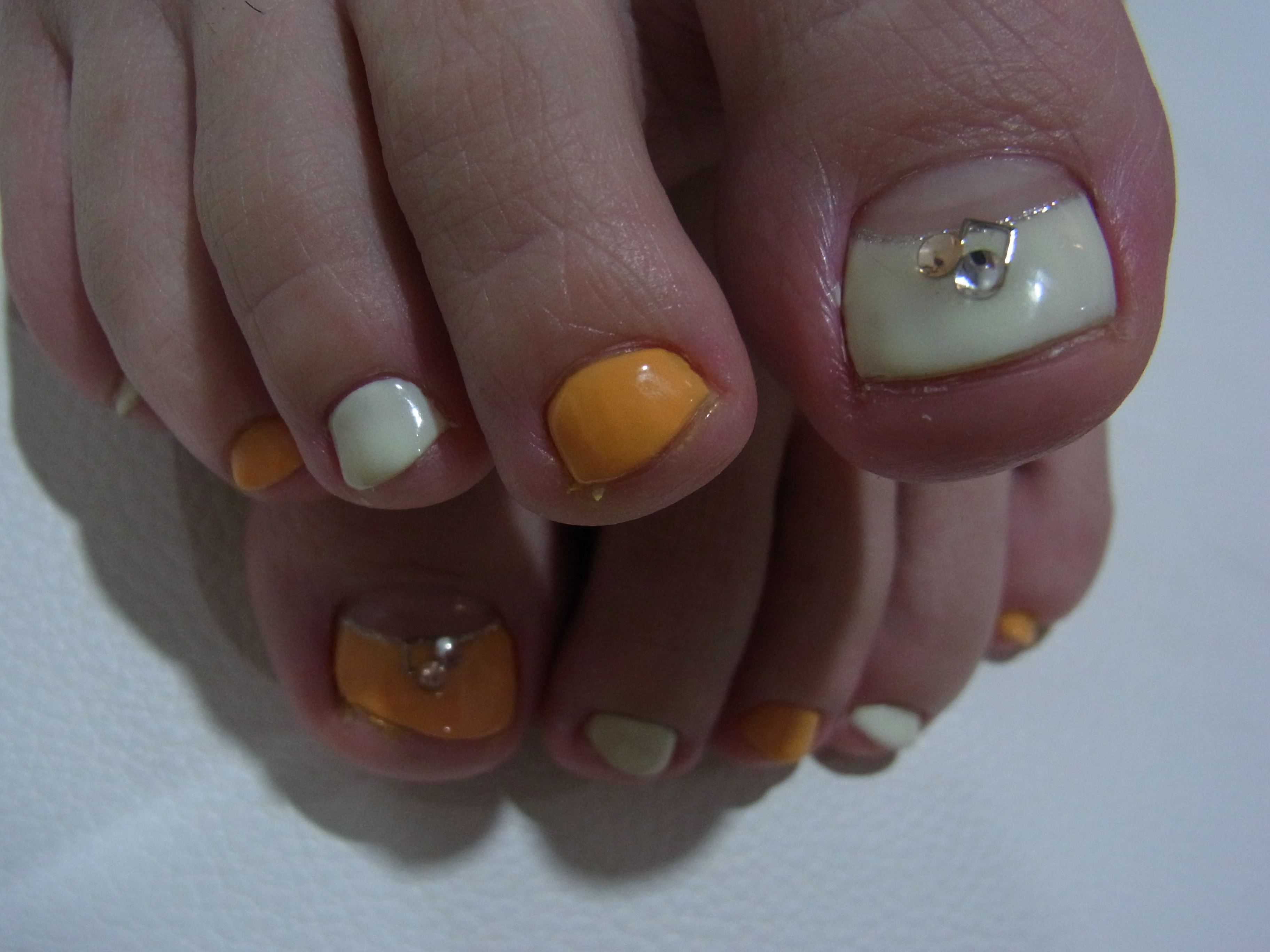 TOP > ネイルデザイン例 > バニラカラー×オレンジのフットネイル
