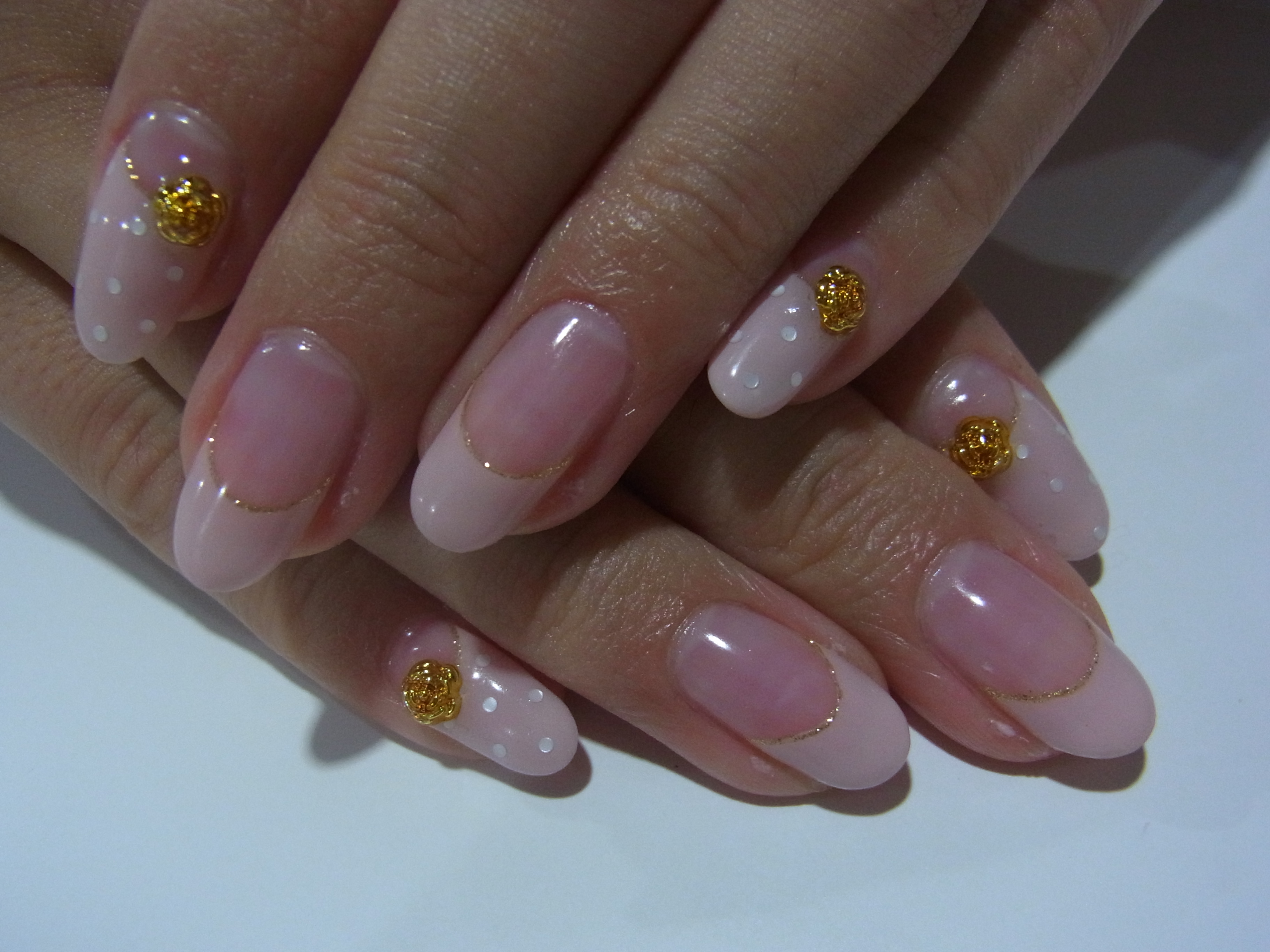 ピンクベージュのフレンチにドットとバラのパーツでキュートに仕上げました
