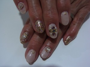 ベージュ×ゴールドに大きめパーツとストーンでキラキラに仕上げました