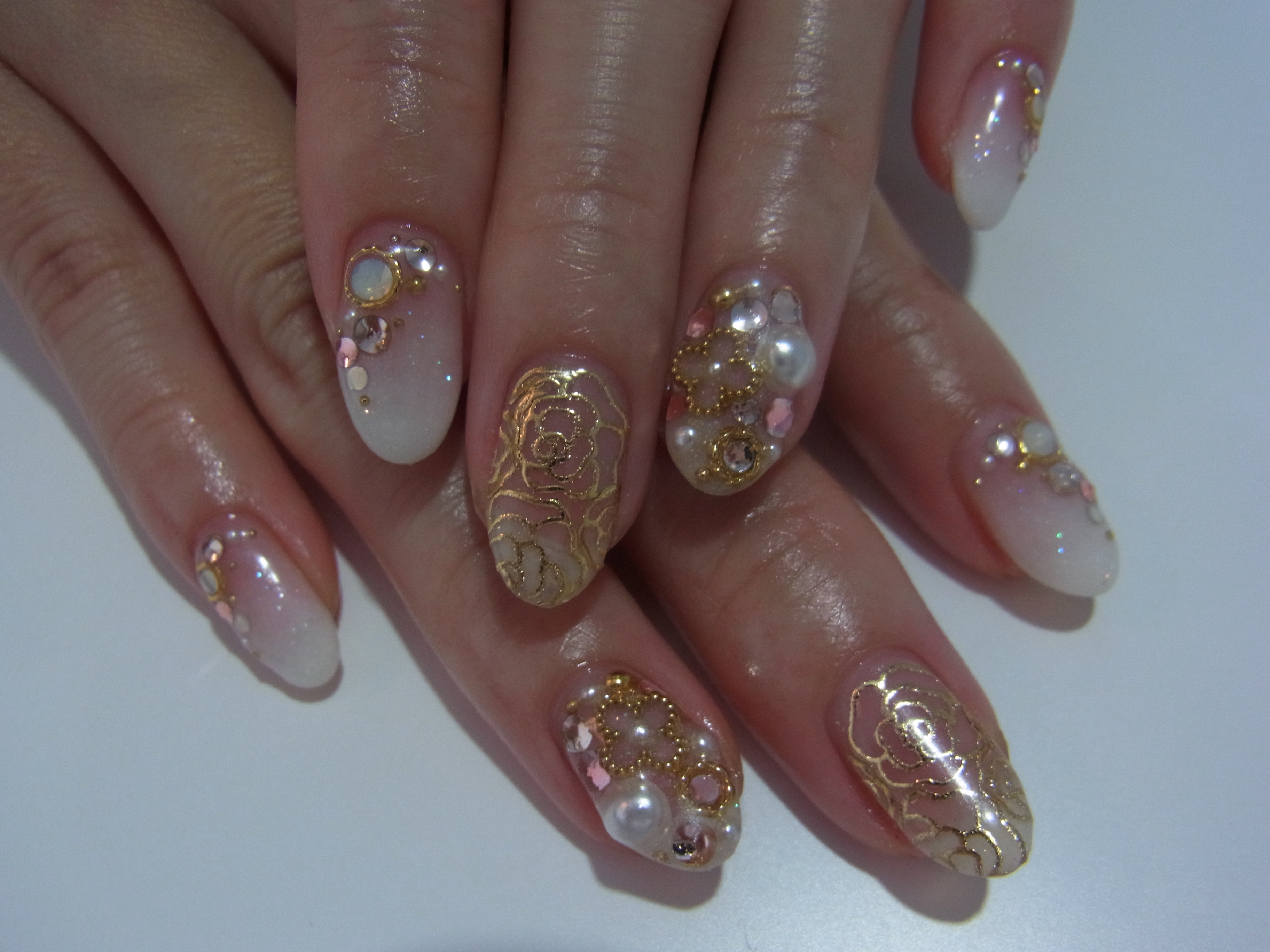 TOP > ネイルデザイン例 > 白グラデ×ゴールドのゴージャスエレガントネイル