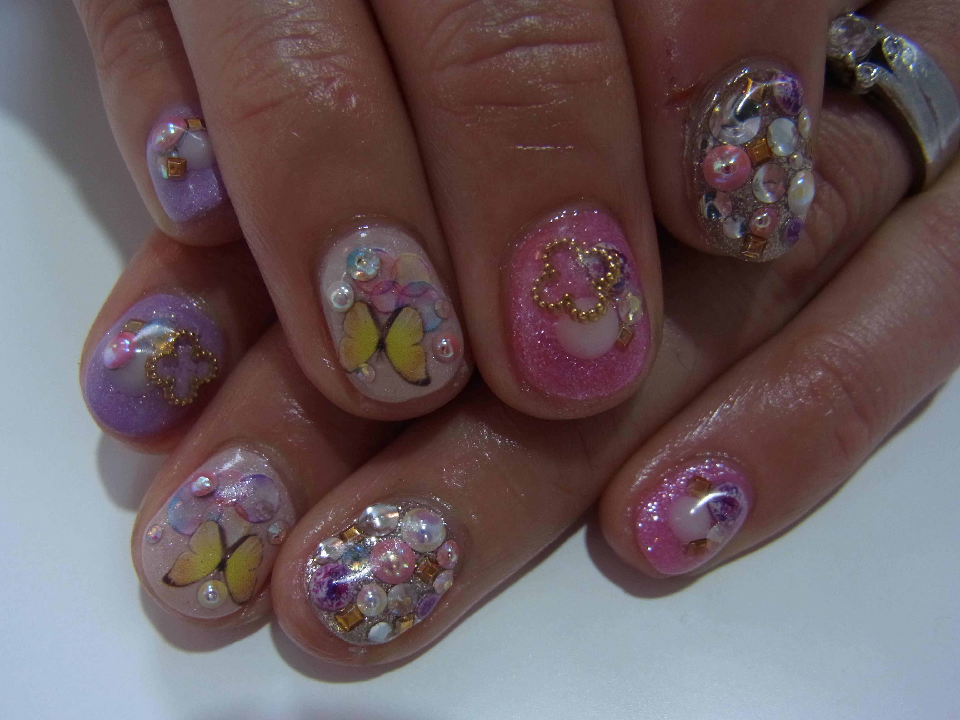 カラフルなベースにストーンと蝶のデザインで華やかにキュートに仕上げました。