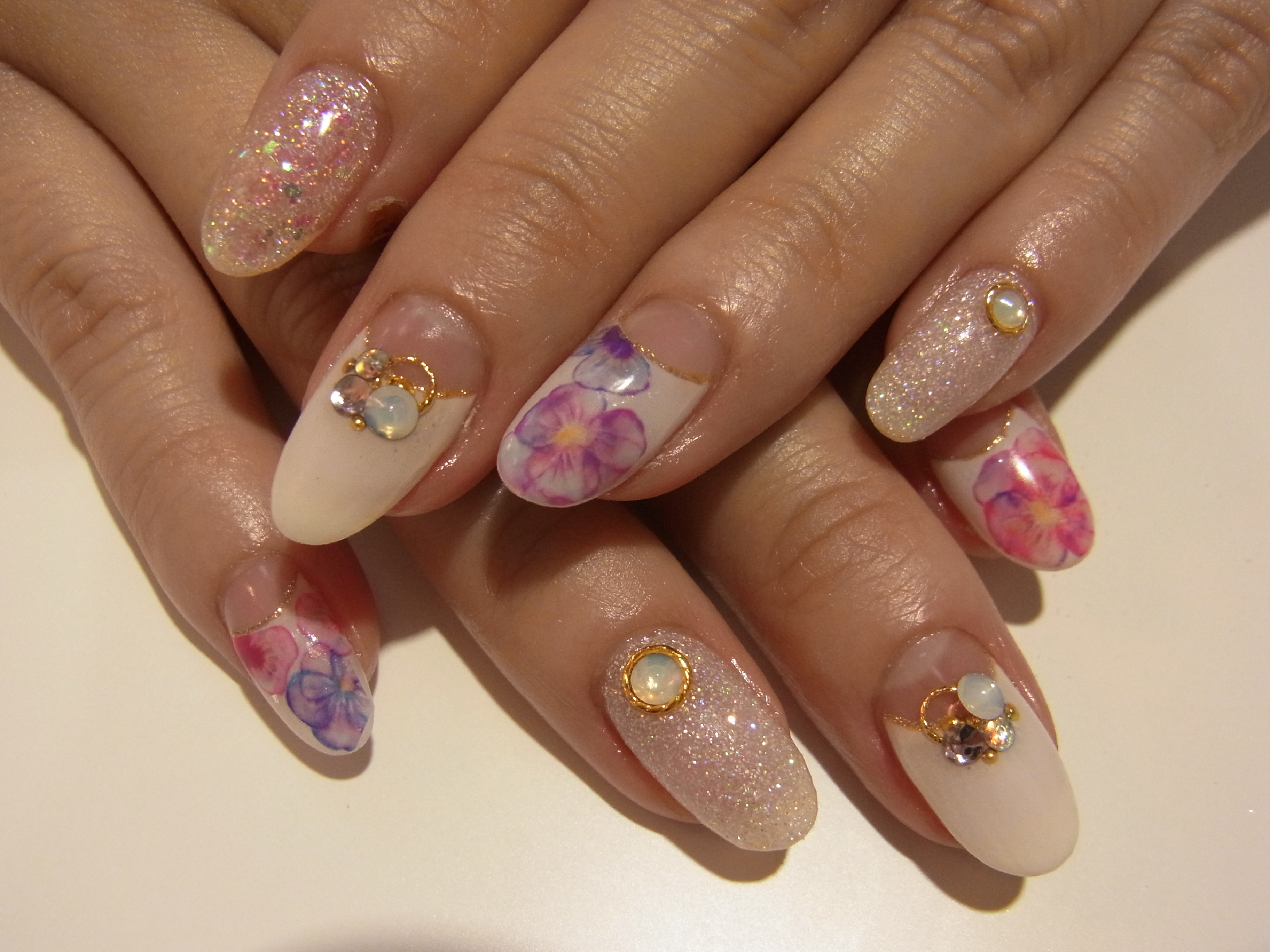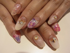 逆フレンチにお花とストーンで大人ネイルに仕上げました。